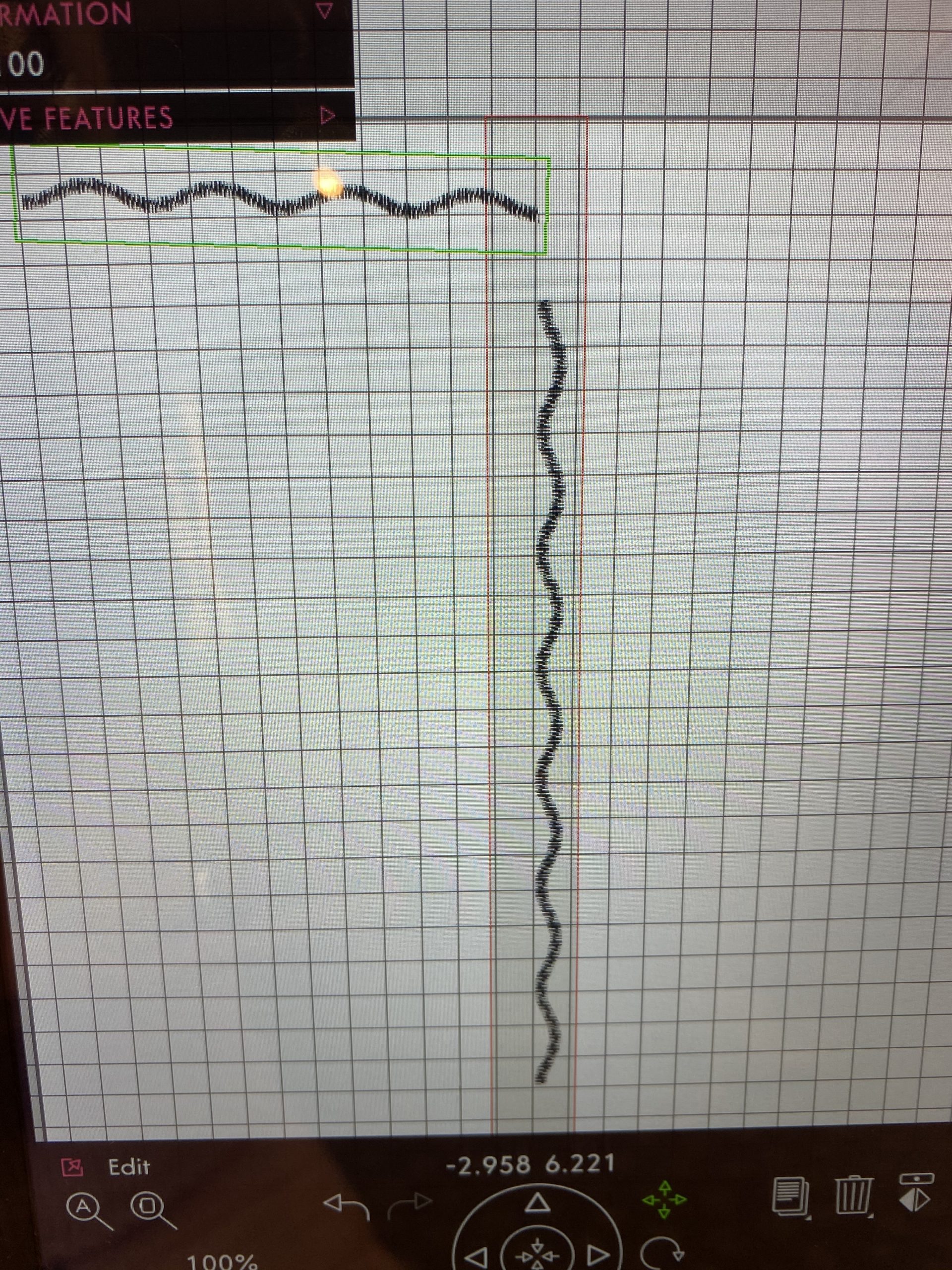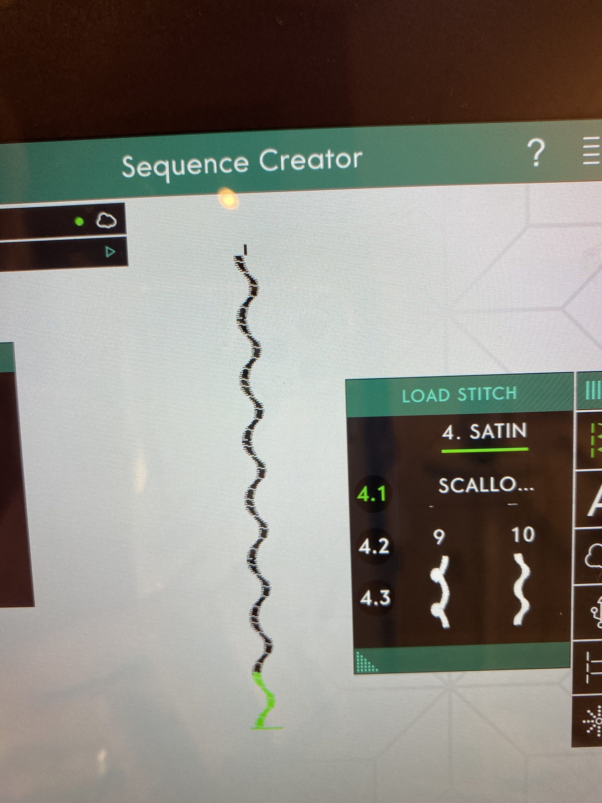 The Creative Icon offers a Sequence Creator feature, in which I can select a stitch, multiply it and save it as a single unit on the SewNet cloud. Amazing…..